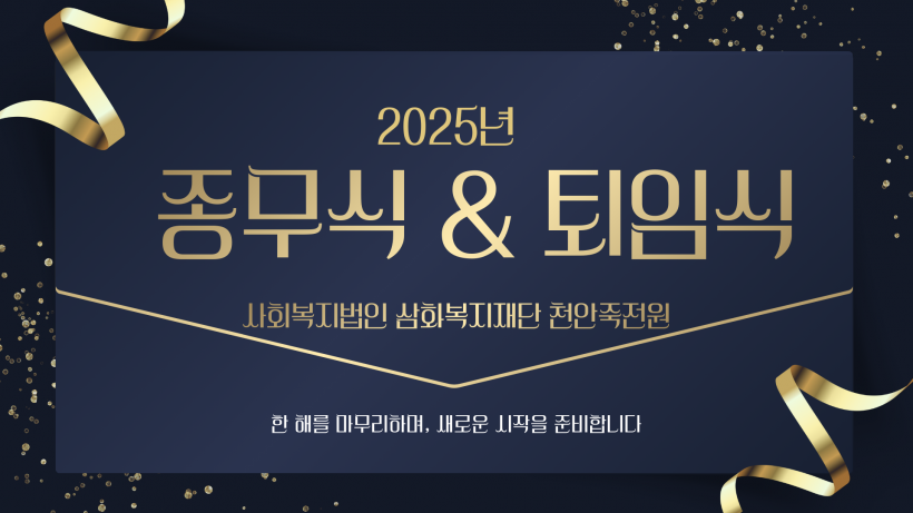 2025년 사회복지법인 삼화복지재단 천안죽전원 종무식 & 퇴임식 페이지 정보 작성자 운영자 작성일25-12-31 13:33 조회225회 댓글0건 관련링크 목록 본문 2025년 사회복지법인 삼화복지재단 천안죽전원 종무식 & 퇴임식을 진행하였습니다.항상 천안죽전원 가족분들의 얼굴에 웃음꽃이 활짝 피실 수 있는 죽전원이 되겠습니다!다가오는 2026년 새해 복 많이 받으세요!감사합니다. 댓글목록 등록된 댓글이 없습니다. 목록