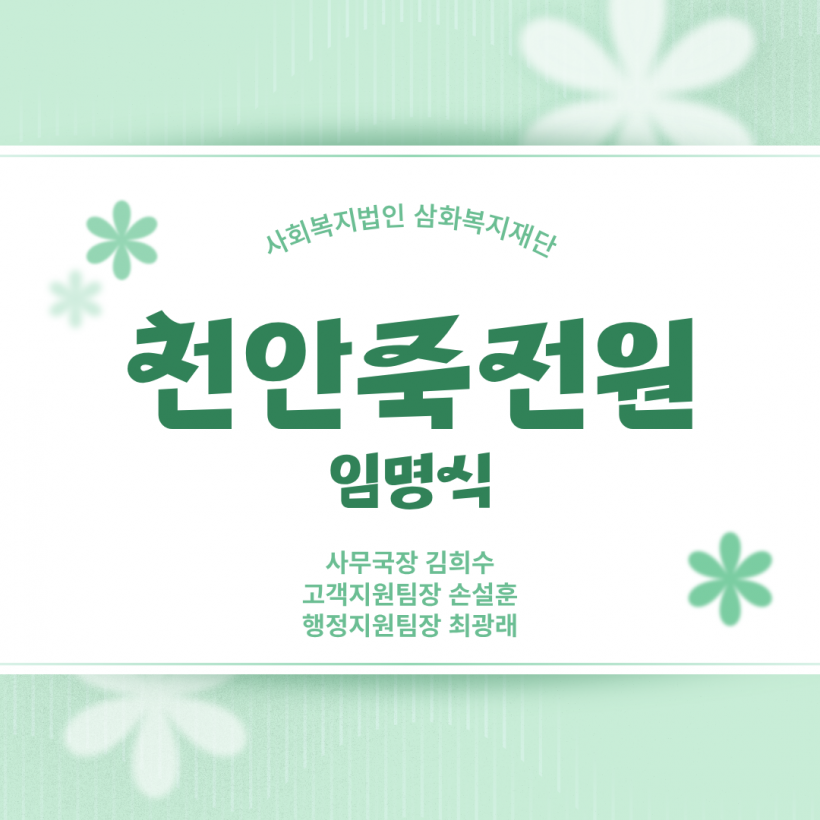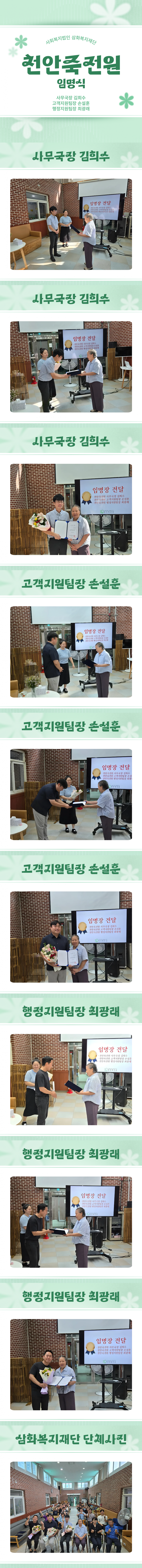 [9월] 사무국장 · 팀장 임명식 페이지 정보 작성자 운영자 작성일25-10-15 17:08 조회156회 댓글0건 관련링크 목록 본문 2025년 09월 01일(월) 김희수 사무국장님, 손설훈 고객지원팀장님, 최광래 행정지원팀장님 임명식을 진행하였습니다.천안죽전원 직원분들과 가족분들께서 뜨거운 박수와 힘찬 응원을 해주셨습니다. 댓글목록 등록된 댓글이 없습니다. 목록