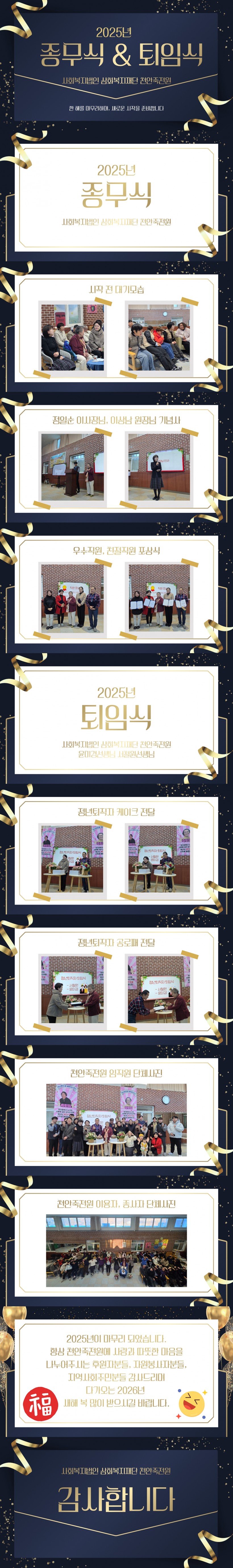 2025년 사회복지법인 삼화복지재단 천안죽전원 종무식 & 퇴임식 페이지 정보 작성자 운영자 작성일25-12-31 13:33 조회52회 댓글0건 관련링크 목록 본문 2025년 사회복지법인 삼화복지재단 천안죽전원 종무식 & 퇴임식을 진행하였습니다.항상 천안죽전원 가족분들의 얼굴에 웃음꽃이 활짝 피실 수 있는 죽전원이 되겠습니다!다가오는 2026년 새해 복 많이 받으세요!감사합니다. 댓글목록 등록된 댓글이 없습니다. 목록