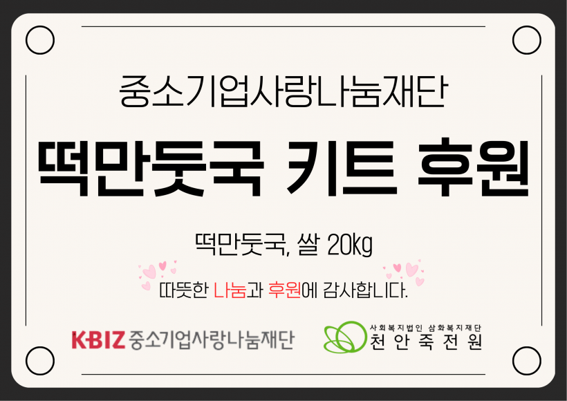중소기업사랑나눔재단 떡만둣국키트, 쌀 후원 페이지 정보 작성자 운영자 작성일26-02-05 13:45 조회196회 댓글0건 관련링크 목록 본문 26.01.28.(수)중소기업사랑나눔재단 떡만둣국키트, 쌀 후원해주셨습니다.가족분들도 환하게 웃으시면서 맛있게 식사 하셨습니다.천안죽전원에게 사랑과 나눔을 해주신 중소기업사랑나눔재단에게 다시한번 감사의 말씀을 드립니다.감사합니다. 댓글목록 등록된 댓글이 없습니다. 목록