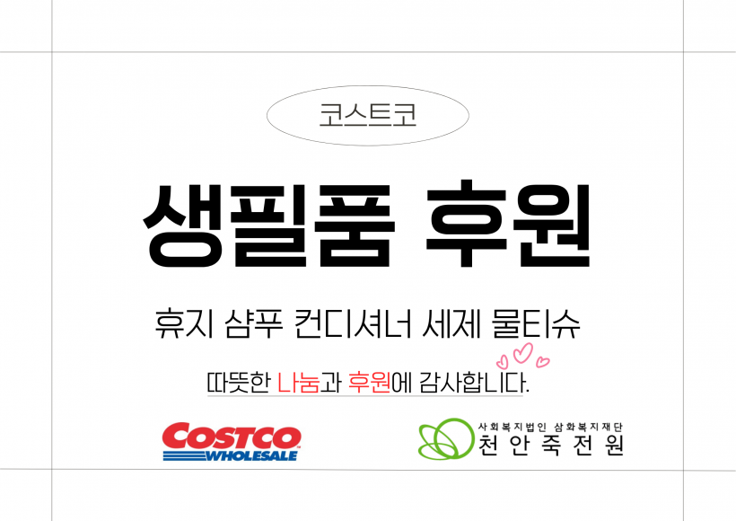 코스트코 생필품 후원 페이지 정보 작성자 운영자 작성일26-02-05 14:15 조회204회 댓글0건 관련링크 목록 본문 26.02.04.(수)코스트코 천안지점에서 휴지, 샴푸, 컨디셔너, 세제, 물티슈를 후원해주셨습니다.천안죽전원 가족분들이 일상생활에서 잘 사용하실 수 있도록 지원하겠습니다.천안죽전원에게 사랑과 나눔을 해주신 코스트코에게 다시한번 감사의 말씀을 드립니다.감사합니다. 댓글목록 등록된 댓글이 없습니다. 목록