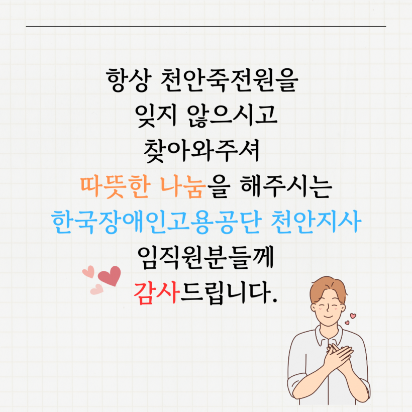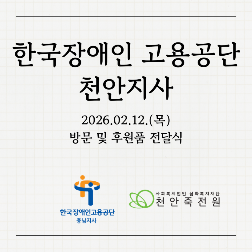 한국장애인고용공단 천안지사 방문 페이지 정보 작성자 운영자 작성일26-02-23 16:00 조회16회 댓글0건 관련링크 목록 본문 26.02.12.(목)한국장애인고용공단 천안지사에서 임직원분들이 방문해주셨습니다.항상 따뜻한 관심과 소중한 나눔을 해주시는 한국장애인고용공단 천안지사 임직원 분들께 감사드립니다. 댓글목록 등록된 댓글이 없습니다. 목록